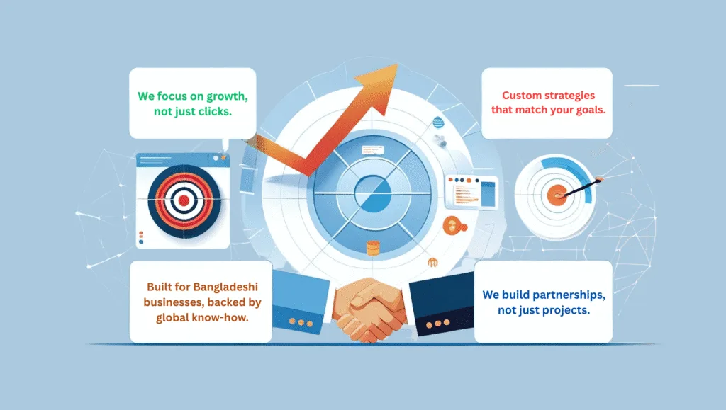 With over 5 years of hands-on experience in digital marketing services in Bangladesh, we’ve helped startups, small businesses, and growing brands navigate the fast-changing online space with confidence. Our journey is built on results, not just promises.